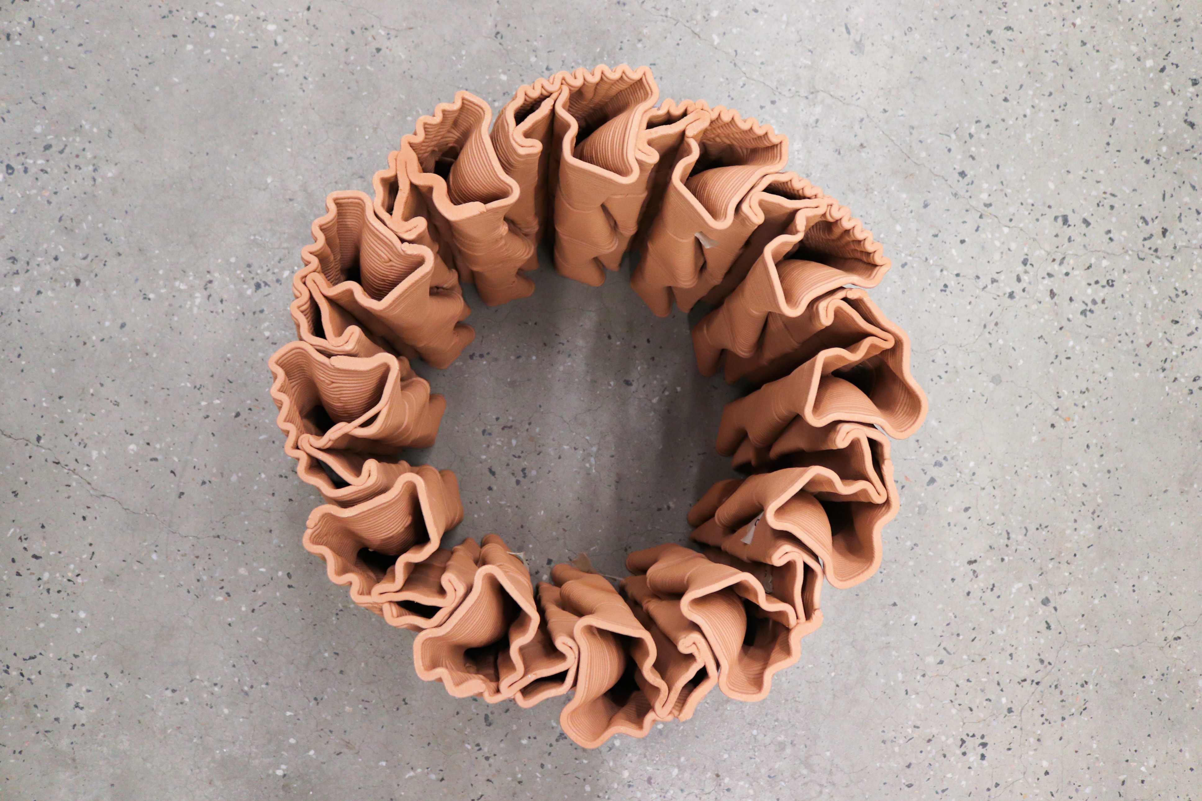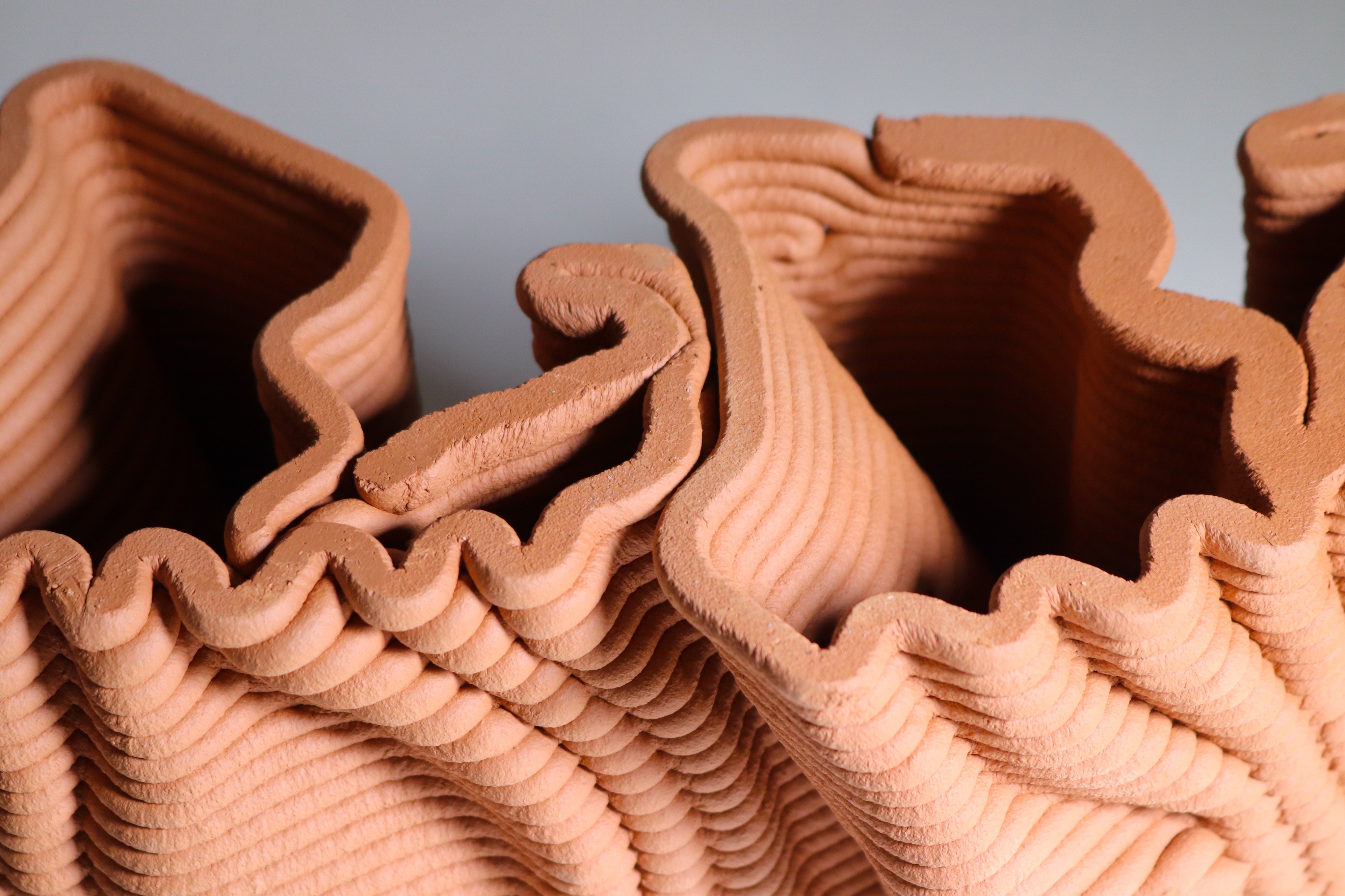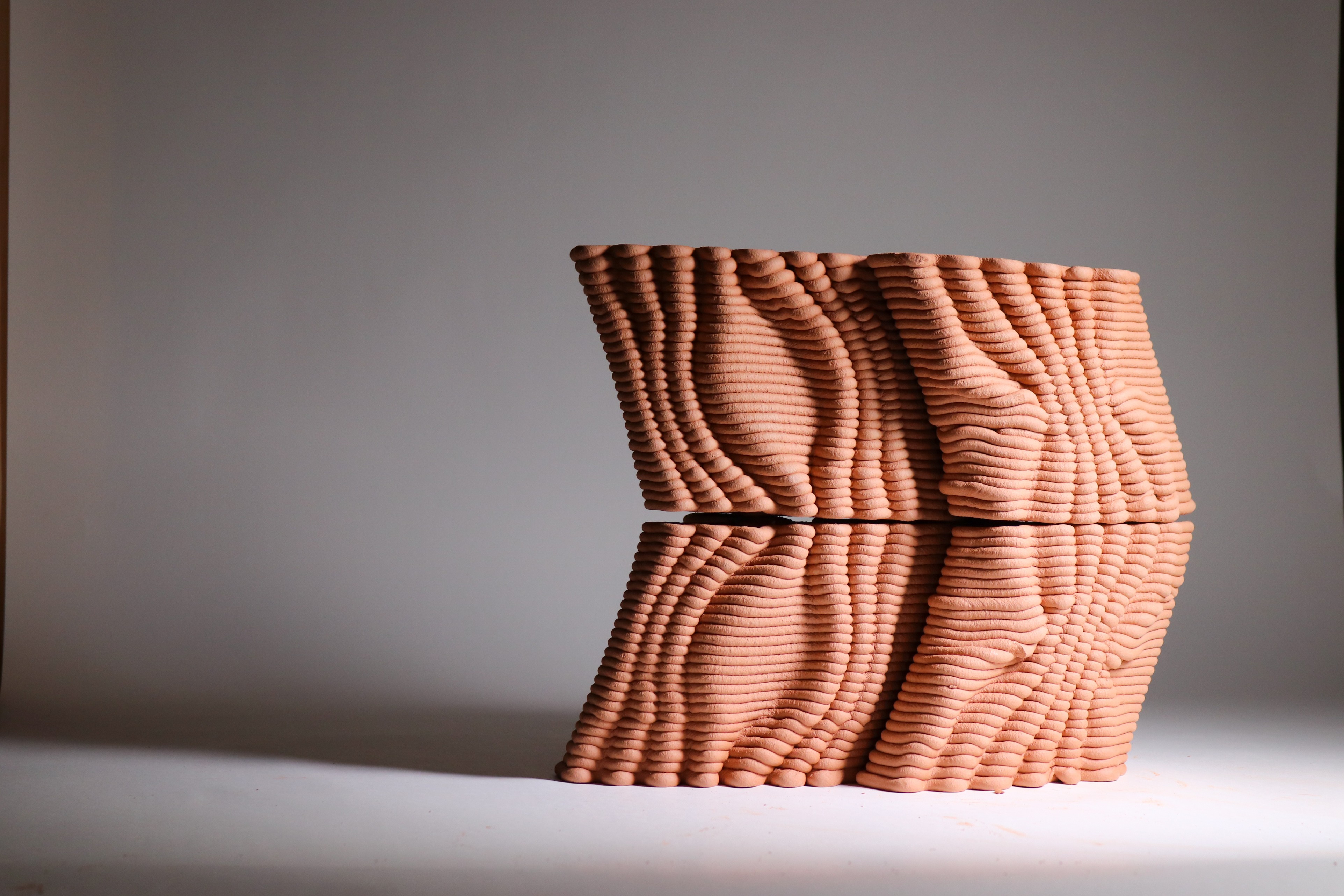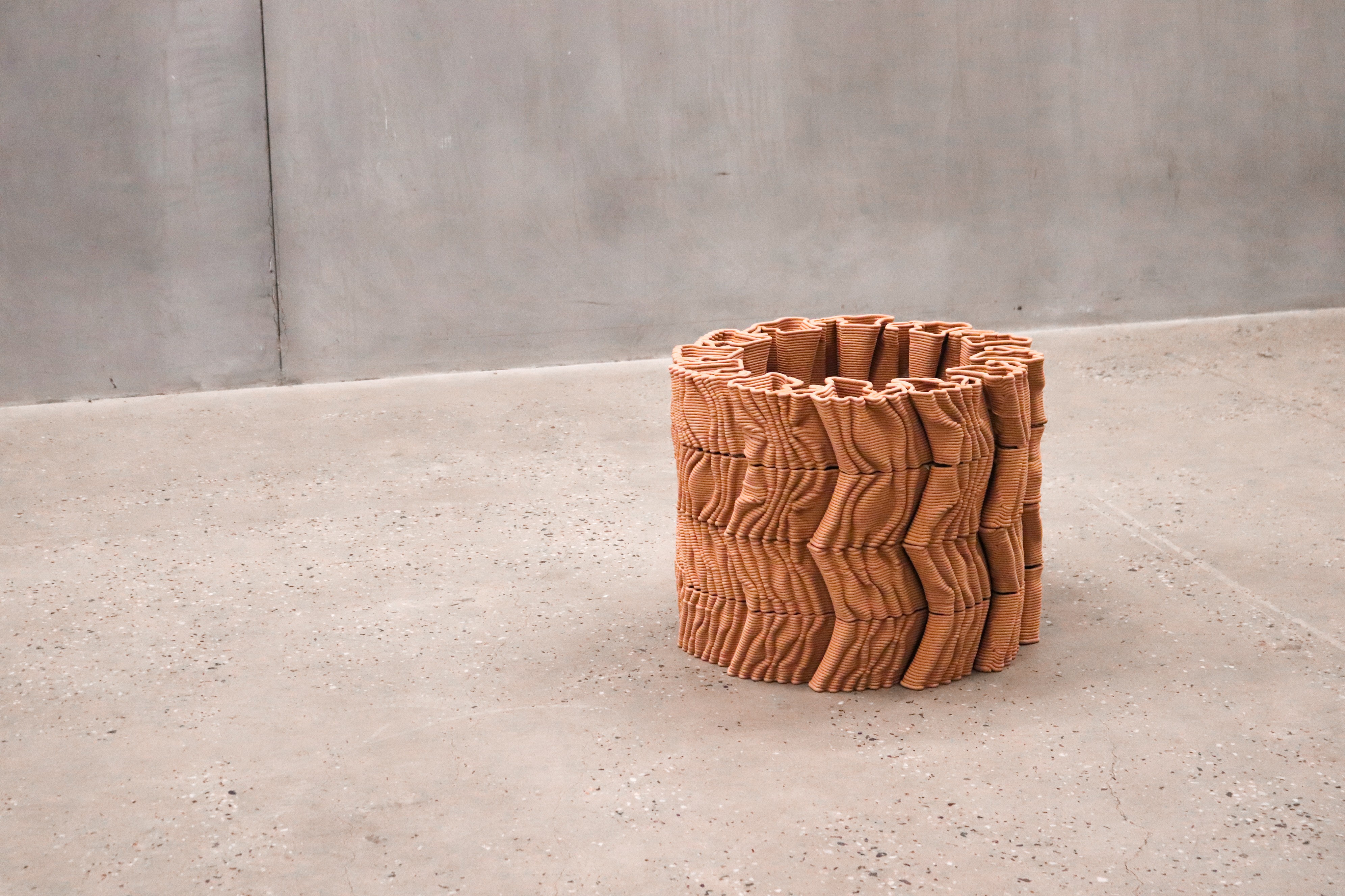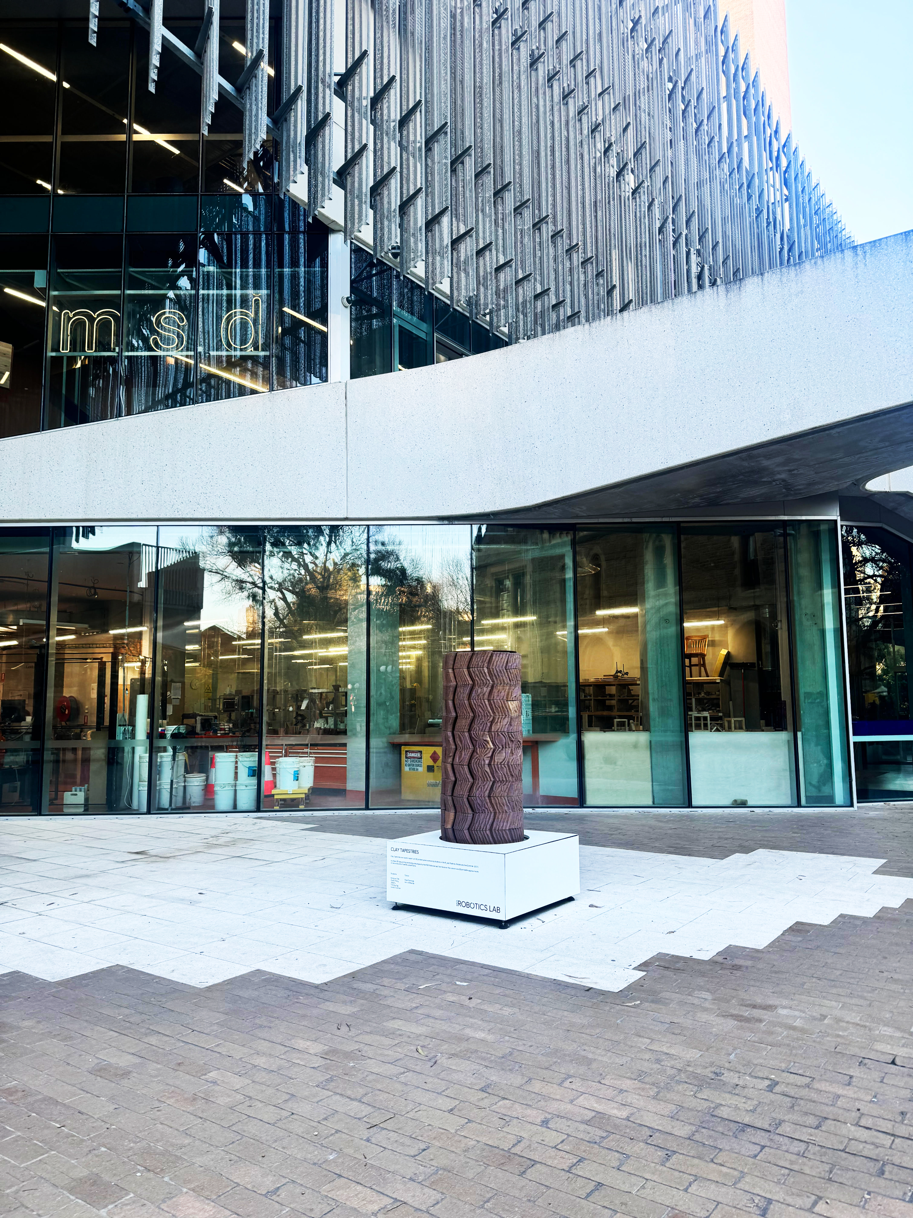 The column invites interaction, allowing people to touch and experience the undulating textures fabricated from clay as they move around it.